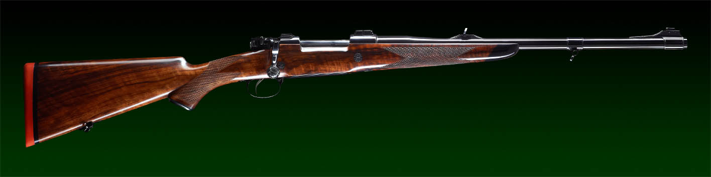Schaft: Handgefertigter Nussbaumschaft in engl. Stil, mit Deutscher Backe und geradem Schaftrücken, Ebenholzabschluss am Vorderschaft, feine Fischhaut, Stahl Pistolengriff Käppchen, Kunststoff Systembettung, Original Silver Gummischaftkappe (BLO), Tru-Oil Finish.