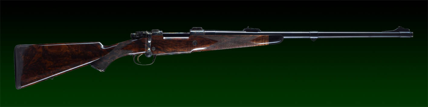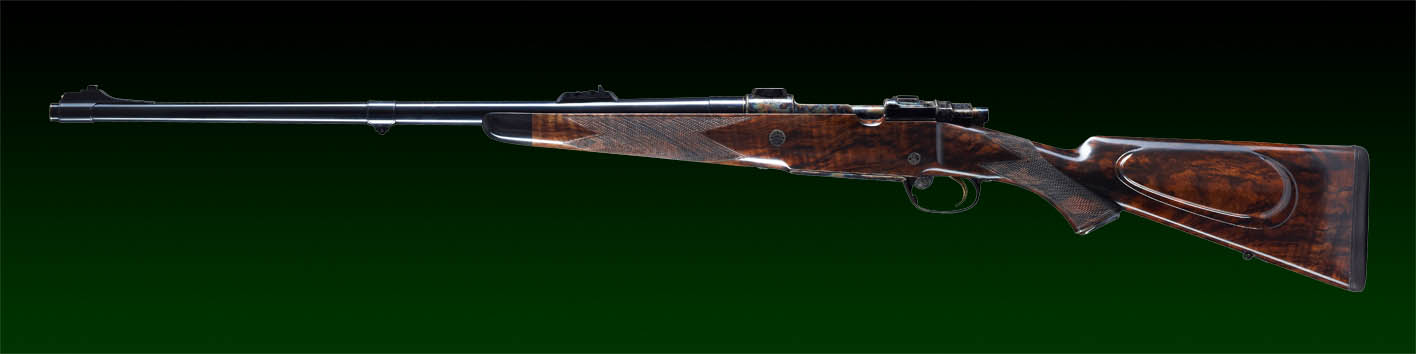 System: M98 Steyr1912, neugefertigter Magnum Magazinkasten, fein eingestellter Recknagel Flintenabzug, flache Sicherung, verlängerter Kammerstängel, Kammergriffkugel umlaufend graviert.