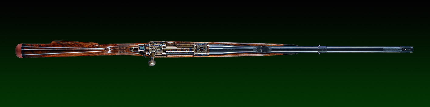 System: M98 Steyr 1912, fein eingestellter Recknagel Flintenabzug, flache Recknagel Secura Sicherung, verlängerter Kammerstengel, Kammergriffkugel umlaufend graviert.