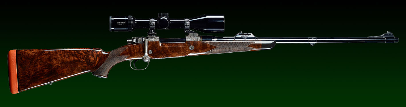 System: M98 DWM, fein eingestellter Recknagel Flintenabzug, flache Recknagel Secura Sicherung, verlängerter Kammerstengel, Kammergriffkugel umlaufend graviert.