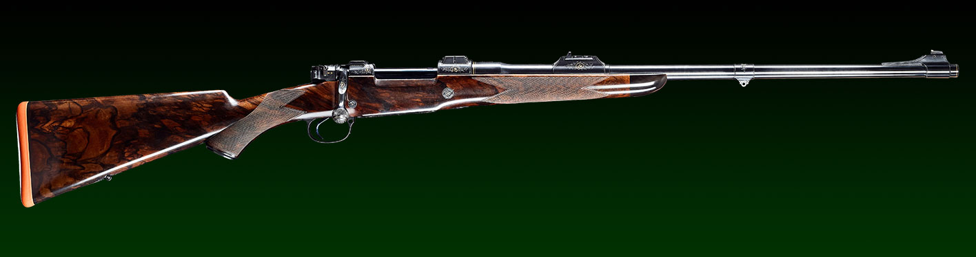 System: M98 DWM, fein eingestellter Recknagel Flintenabzug, flache Recknagel Secura Sicherung, verlängerter Kammerstengel, Kammergriffkugel umlaufend graviert.